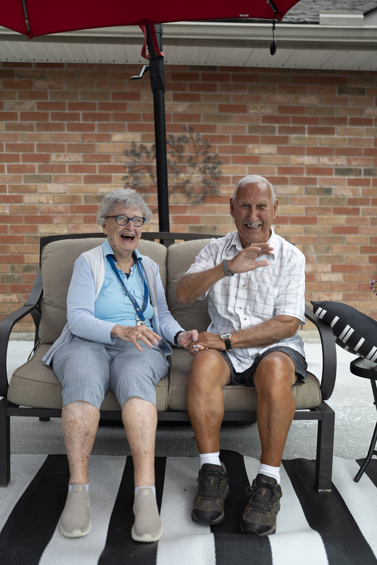 Two residents sharing laughter on the patio at Atrium Retirement Residence in Orillia.